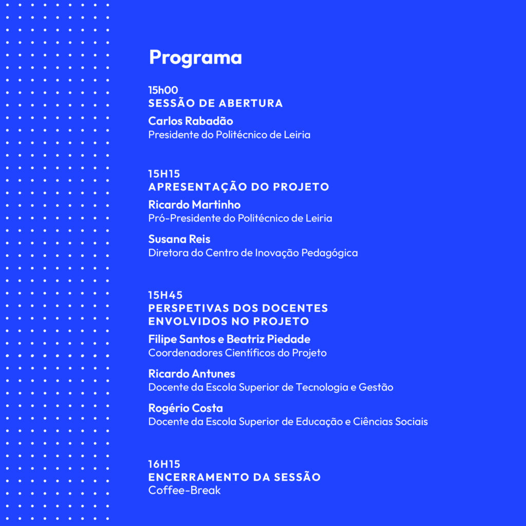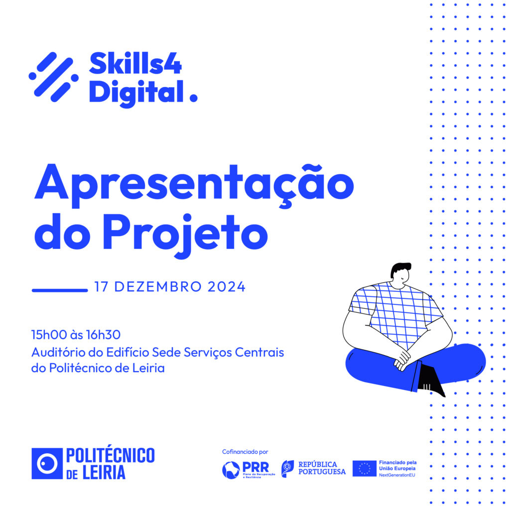 Sessão de Apresentação do Projeto Skills4Digital, que se realiza no próximo dia 17 de dezembro de 2024, pelas 15h00, no Auditório do Edifício Sede – Serviços Centrais do Politécnico de Leiria(Rua General Norton de Matos, Leiria).